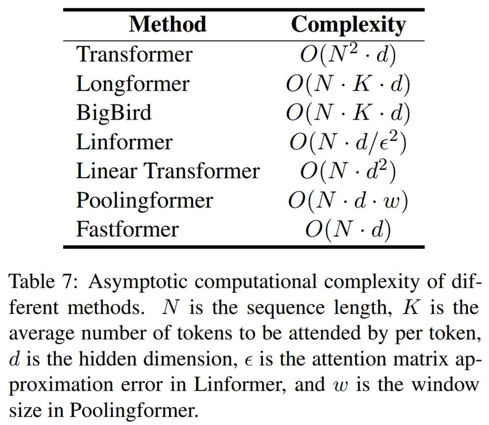 研究者评估了不同模型的效率。他们首先比较了不同模型的理论计算复杂度,如下表 7 所示,Fastformer 在理论上是高效的。