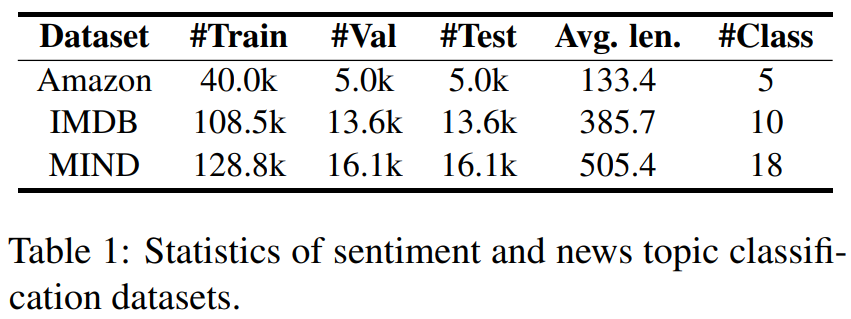 下表 1 为情感与新闻主题分类数据集 Amazon、IMDB 和 MIND。