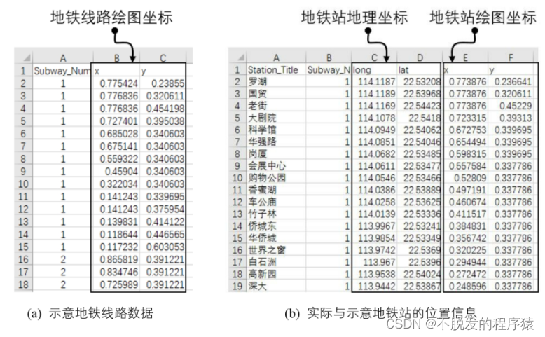 实际地铁线路图的数据,可以先从网上下载各个地铁站的名称以及对应的站号,再使用Python语言根据地铁站名,在高德地图自动查找对应的地理经纬坐标(long,lat),如下图所示:
