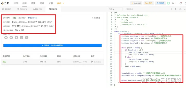 largeTail = largeTail.next,即 largeTail = 4当 head = 3 时,3 >= 3,将该节点插入到大链表中:largeTail.next = head,即 largeHead.next = 4 -> 3