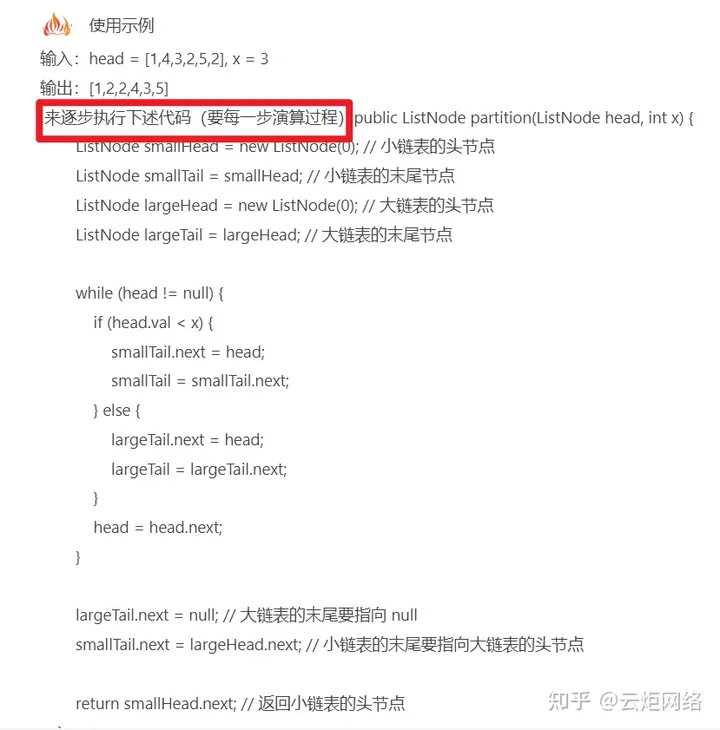 largeTail = largeTail.next,即 largeTail = 5当 head = 2 时,2 < 3,将该节点插入到小链表中:smallTail.next = head,即 smallHead.next = 1 -> 2 -> 2