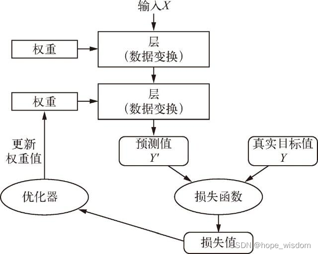 一开始对神经网络的权重随机赋值,因此网络只是实现了一系列随机变换。其输出结果自然也和理想值相去甚远,相应地,损失值也很高。但随着网络处理的示例越来越多,权重值也在向正确的方向逐步微调,损失值也逐渐降低,这就是训练循环(training loop)。将这种循环重复足够多的次数,得到的权重值可以使损失函数最小。具有最小损失的网络,其输出值与目标值尽可能地接近,这就是训练好的网络,其输出我们称之为模型。