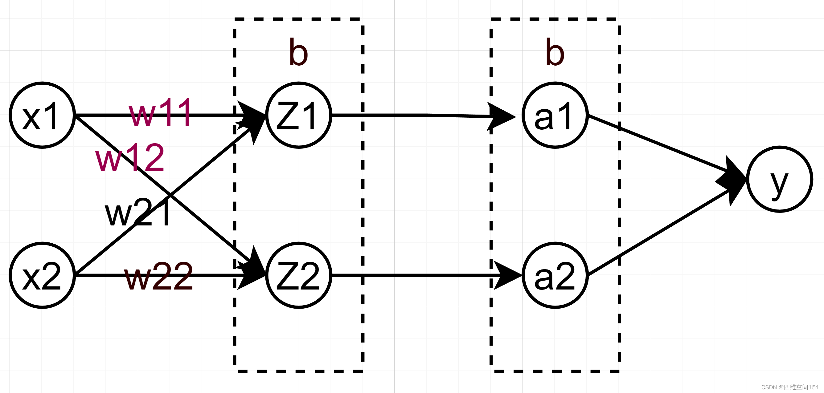 说明下:x1、x2 作为输入参数也就是样本,Y作为样本对应的真实值,w11、w12、w21、w22作为权重,b作为偏移常数,圆圈代表输入或者输出节点:x系列代表输入层、z系列代表隐藏层、a系列代表隐藏层(激活),y代表样本预测。