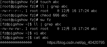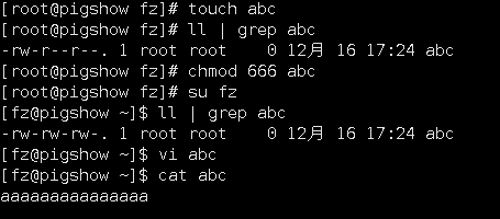 首先用root建立一个文件abc,并赋予666的权限,再切换到普通用户fz