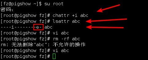 此时可以看到普通用户修改abc文件成功,然后再切换到root用户给abc文件添加chattr属性:(e是文件系统ext4的缩写)