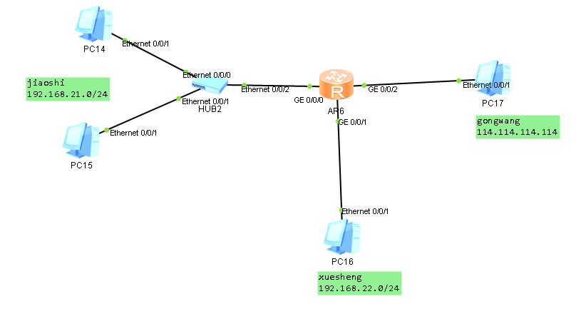 #目标:教师每天6点到23点,可以上网;学生周一到周五8点半到22点可以上网,周六周日两天任何时刻都上网 #分析:要实现基于时间的,就需要进行划分流量,然后阻断,所以,时间可以看成,教师(jiaoshi)室每天早上0点到6点半不能,以及晚上23点到23点59不能上网;学生(xuesheng)周一到周五的早上0点到8点半,以及晚上22点到23点59不能上网