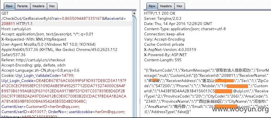 佑一良品(www.uiyi.cn)主站多处平行越权漏洞,主要有以下几个功能: