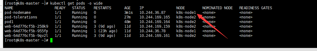 nodeName:指定节点名称,用于将Pod调度到指定的Node上,不经过调度器。 使用场景:一般做测试用 案例:apiVersion: v1 kind: Pod metadata: creationTimestamp: null labels: run: pod1 name: pod-nodename spec: nodeName: k8s-node1 containers: - image: nginx # 主容器 name: web负责调度的是这一句,因为直接指定节点,所以不经过调度器,污点以及标签适配对他无效,直接被分配到指定的node1 nodeName: k8s-node1