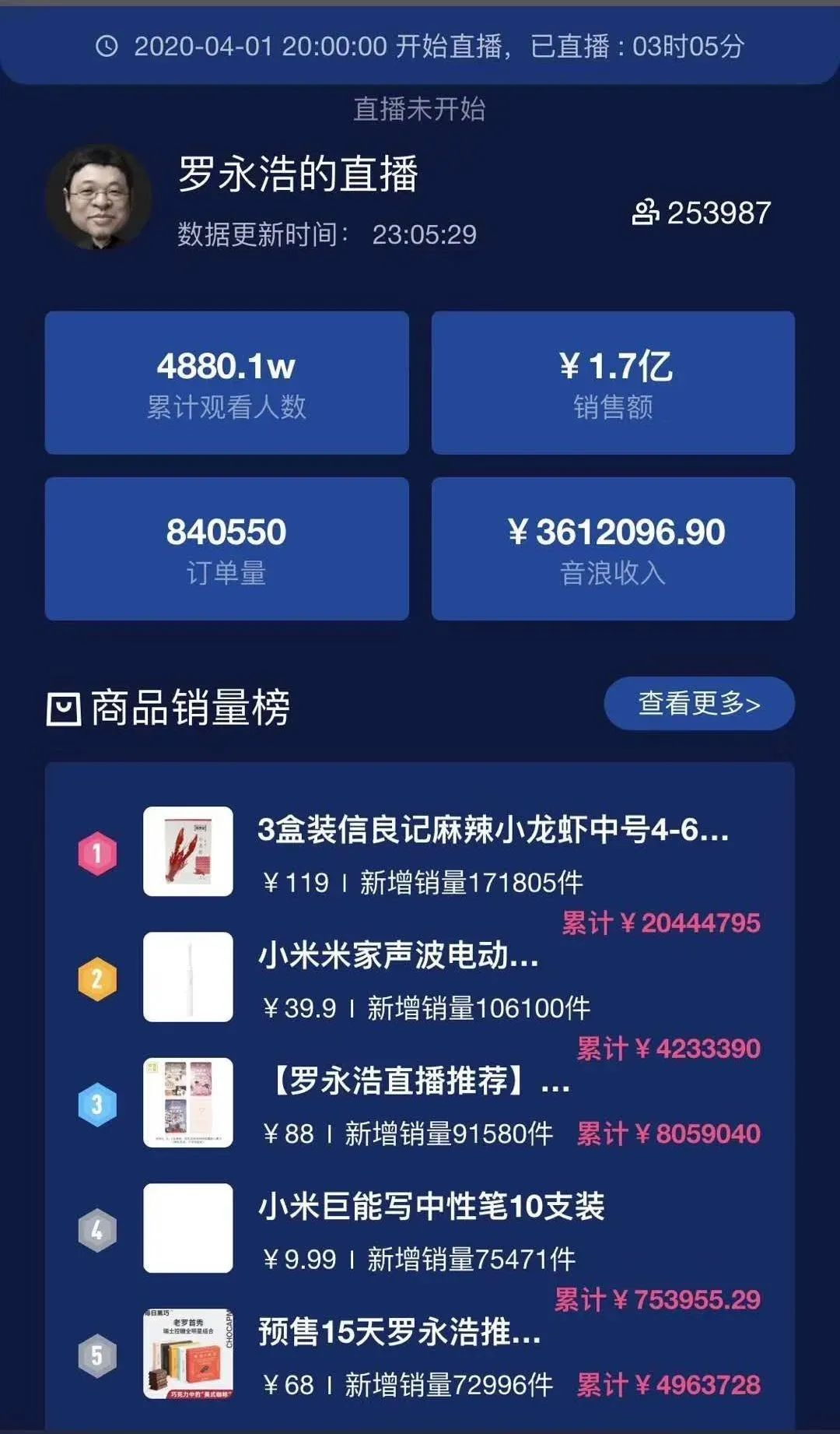 4.1日罗永浩在抖音进行了直播首秀,销售额1.7亿,可谓战绩斐然。