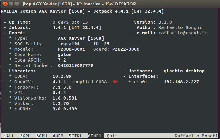 首先可以切换到6INFO面板,可以查看当前系统的一些基本信息,包括jetpack版本、opencv版本、cuda版本、tensorrt版本、局域网ip等。