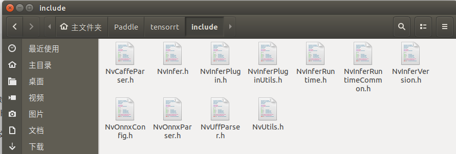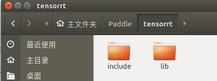 首先在下载的Paddle工程下创建一个名为tensorrt的文件夹,然后在tensorrt文件夹下创建两个子文件夹:include和lib。其中include用来存放tensorrt的.h头文件,lib用来存放tensorrt的.so和.a库文件。如下图所示: