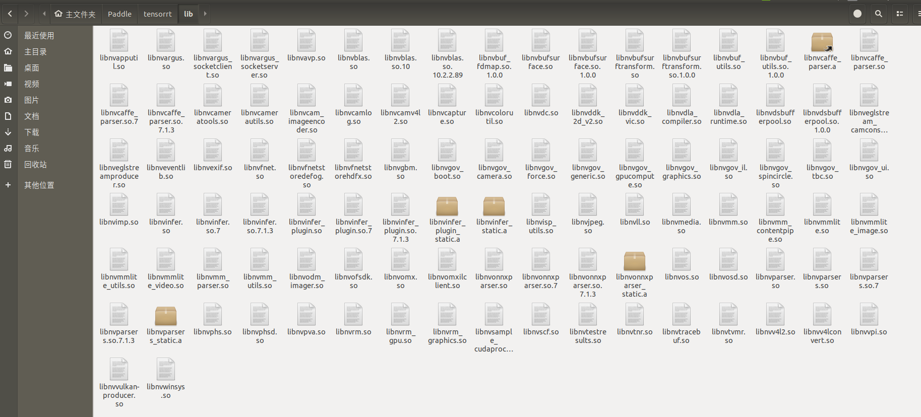 由于我们后面需要编译支持tensorrt的paddle库(tensorrt是英伟达推出的针对英伟达GPU做的推理加速引擎),因此我们先要准备好tensorrt库目录,保证后面的paddle工程能够正常的找到这个tensorrt库。首先手动在jetson的usr/文件夹中找到tensorrt库文件(包括.h、.a和.so文件),这些库文件分别在在 /usr/include/aarch64-linux-gnu和/usr/lib/aarch64-linux-gnu 下面。具体到每个文件夹下面只需要搜索Nv和libnv开头的文件然后拷贝到指定目录下即可。