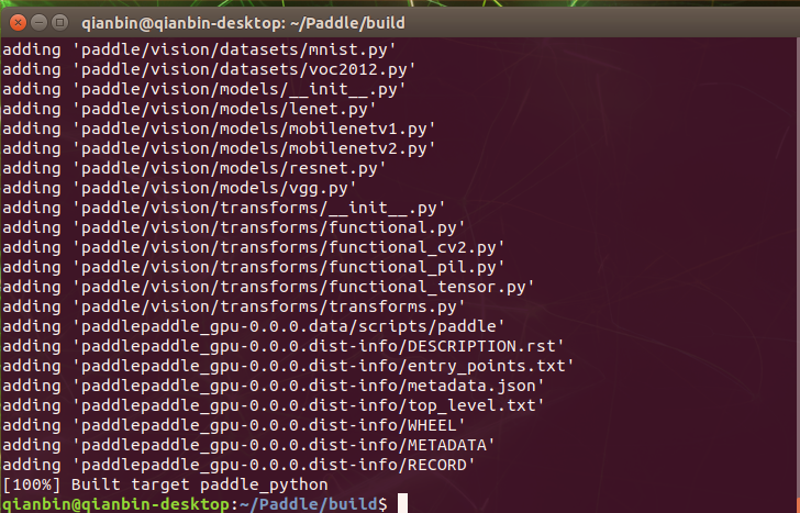 值得注意的是,我们同时还同时编译出来来python安装包,位于目录/home/qianbin/Paddle/build/python/dist下面,直接通过pip安装这个whl文件就可以在jetson上使用python版paddle进行推理了。