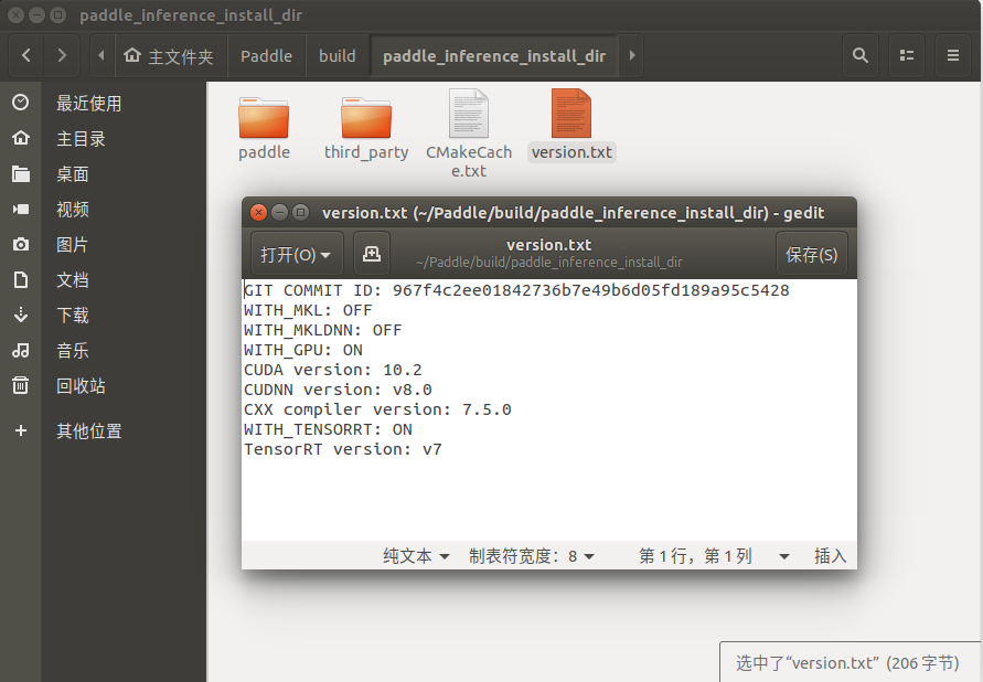 编译完成后,预测库位于/Paddle/build/fluid_inference_install_dir目录下面,目录结构及version.txt内容如下: