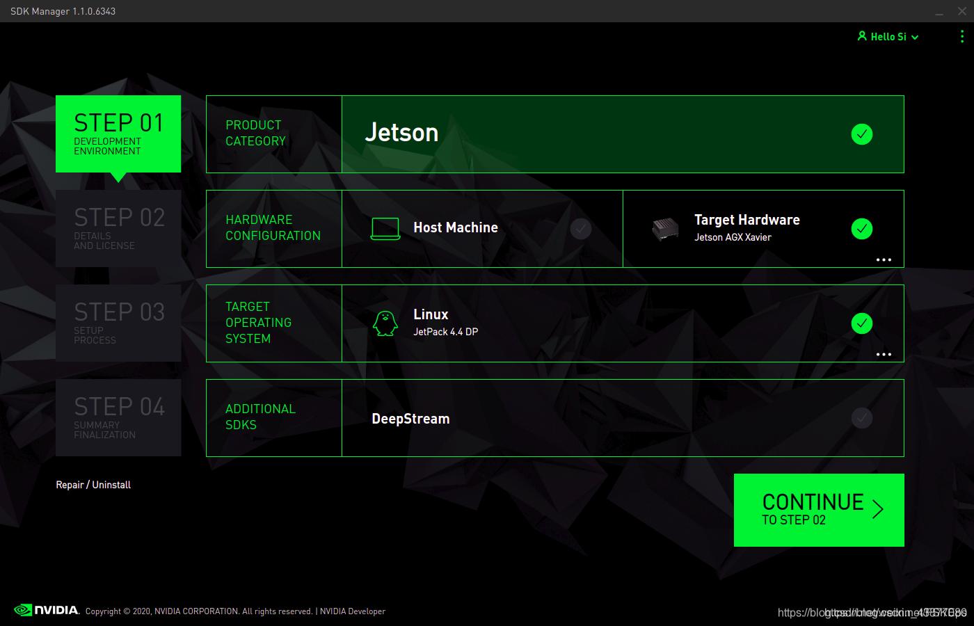 打开SDK Manager后,会转到网页版英伟达登录页面,输入英伟达账号和密码,验证通过后SDK Manager会自动进入主界面(注意:如果显示 OOPs,是网络的原因,多试几次就可以了,推荐有线网络连接,更稳定一些以,另外,一般早上网络会好一些)。