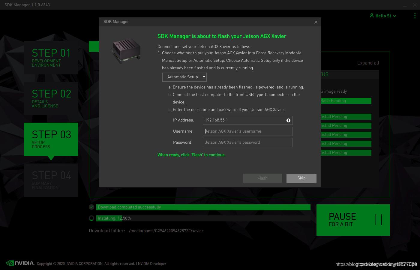 此时先按住位于xavier侧面正中间的强制恢复按钮不放(上图中标识1的按键),再按住开机按钮不放(标识2的按键),等待2s后同时松开。此时,可以看到xavier正面白色电源指示灯亮起。打开host端的终端,输入 lsusb 命令,如果看到 NVidia Corp 则说明 xavier 与host端连接成功。接下来点击 Flash 按钮,开始烧录 OS 镜像。烧录完 OS 镜像后(总进度完成 25%),会跳出以下界面(注意:此处不要输入username和password,会报SSH服务错误,因为xavier的ubuntu系统还没有设置):