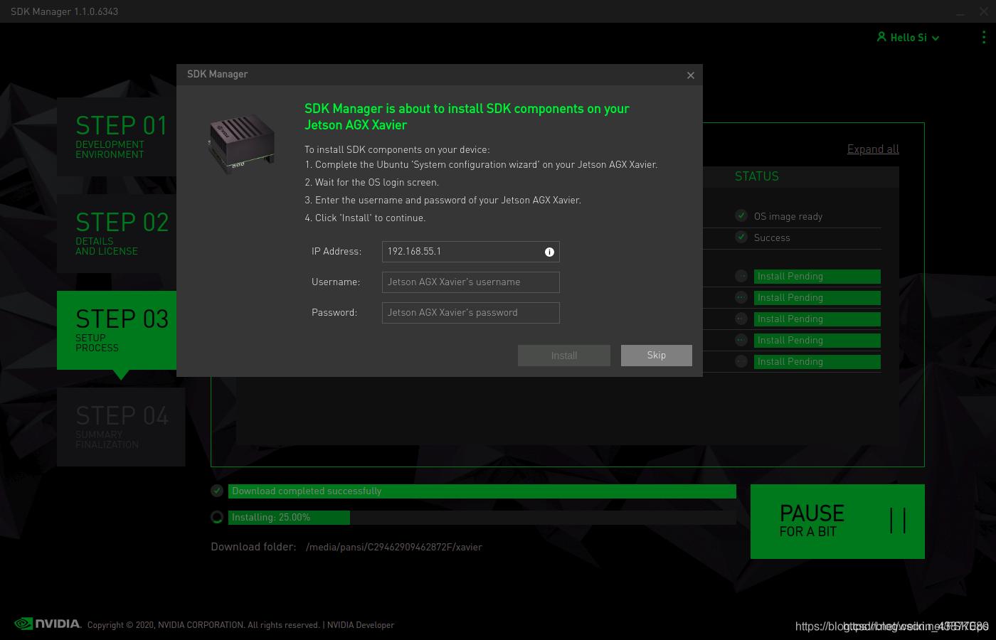 此时xavier 会自动开机,给Xavier 连上显示器,进入 ubuntu 系统设置界面,然后设置好用户名和密码。然后确保jetson设备和主机host在同一个局域网内,简单的做法可以直接用网线连接host端和Xavier,然后回到刚才的安装界面,输入刚才在 xavier 上设置的用户名和密码,然后点击安装。