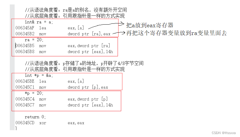 {int a = 10;//从语法角度看:ra是a的别名,没有额外开空间//从底层角度看:引用跟指针是一样的方式实现int& ra = a;ra = 20;//从语法角度看:p存储了a的地址,p开辟了4/8字节空间//从底层角度看:引用跟指针是一样的方式实现int *p = &a;*p = 20;return 0;