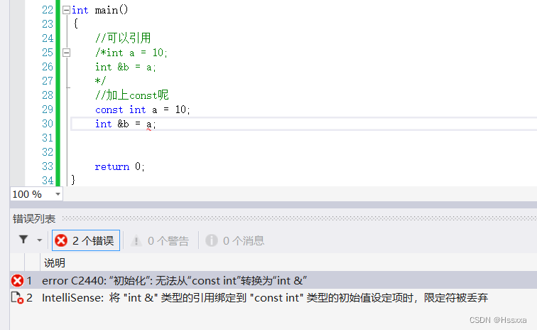 就比如下面这段代码加上const之后就出现报错了,这就需要了解一下引用原则了。