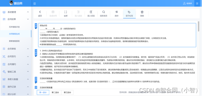智合同的合同智能起草工具有多种场景应用。其有标准模板起草工具、参考范本库智能起草、合同条款大数据应用等。通过应用此工具大大的提高了法务的工作效率,节约时间成本,同时减少了合同审批流程的工作量,为企业合同起草、审批等工作赋能。