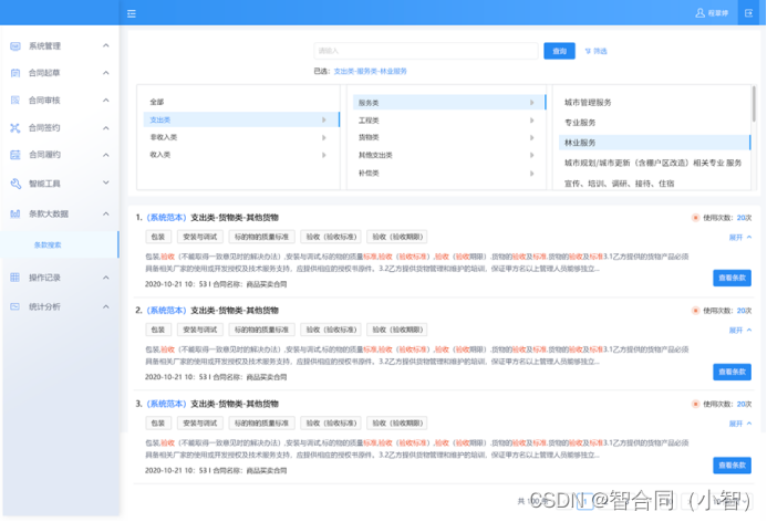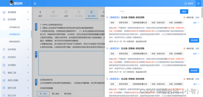 平台采用智能索引技术,实现对条款标签、条款内容的精确搜索。本项服务包含索引词库的更新维护,以提升整体搜索的准确率和速率。此功能也是实现“智能合同起草”功能的基础,经办人员可以按照实际需要搜索选择最合适条款,并制作出高质量的合同/合同范本,条款库只是制作合同/合同范本的基础数据和辅助工具,承办人本身需要对合同/合同范本负责。
