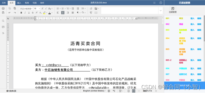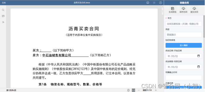 通过在网页上填表完善合同关键信息的方式起草合同,在业务管理过程中,通常这类合同无需法务再审。同时,该工具可将网页填写的关键要素回传给主数据系统,供其他业务系统复用。