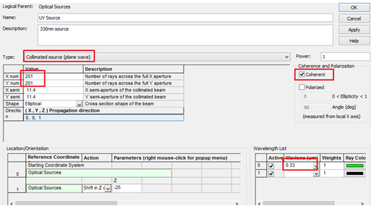 光线追迹使用相干光线追迹,FRED的相干光技术高斯光束分解技术,为了使圆锥表面中心点光线错误最小,需要追迹大量的光线。本例中,我们使用201*201的格子光。