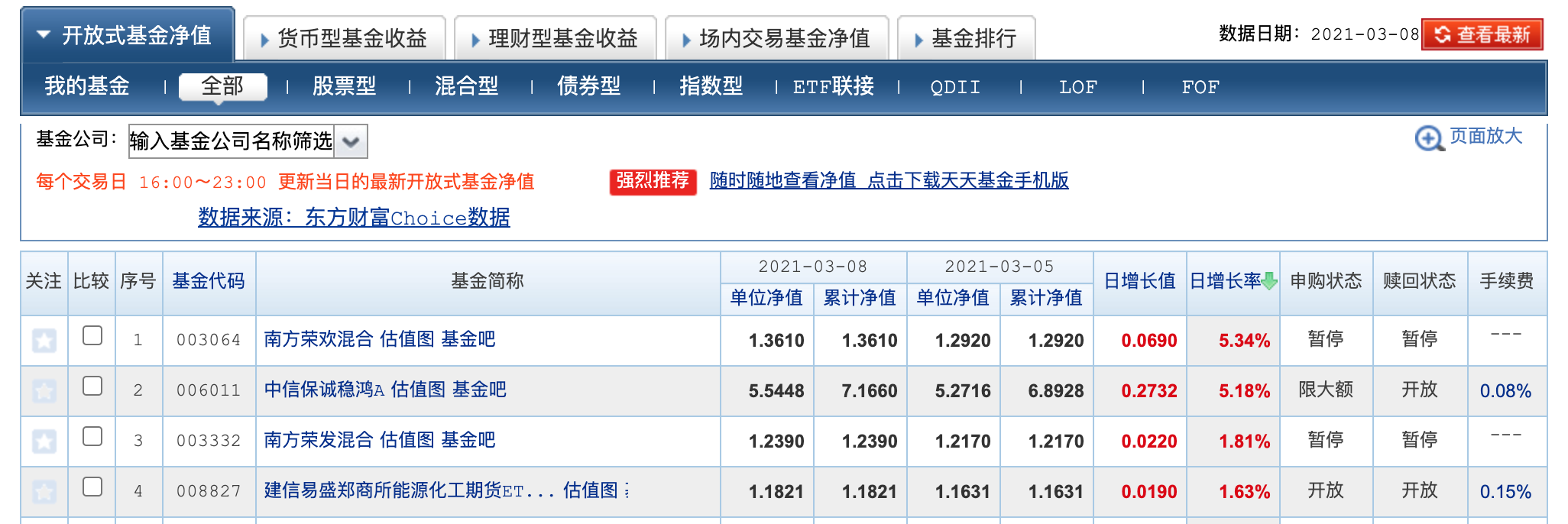 天天基金首页→基金数据(更多)→开放式基金(更多),到达每日开放基金列表页,页面如下: