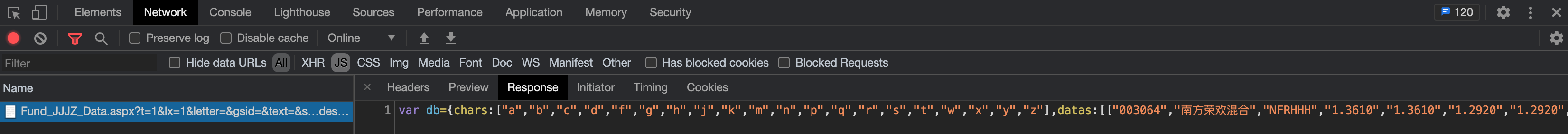 打开chrome开发工具,network,js,点击下一页时,发现页面请求了一个接口,该接口返回了基金列表相关数据,如下: