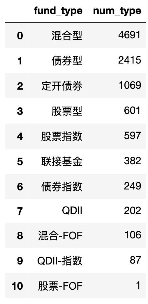 笔者总抓取了10400个基金数据,按照基金类型聚合,结果如下: