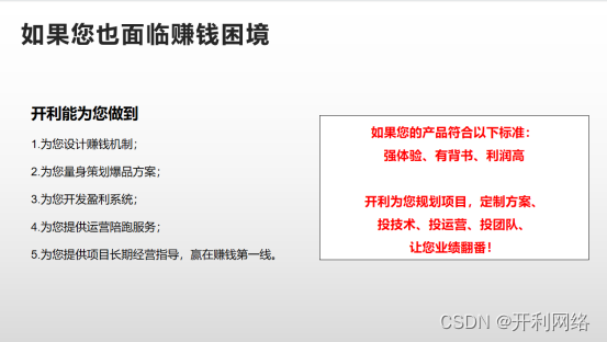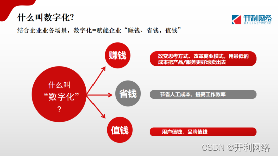 2022年10月17日,开利网络受邀出席第十届商务合作促进会议暨广州市现代办公设备行业商会会员大会,并进行了“企业数字化盈利增长之道”主题分享。开利网络表示,从营销层面而言,企业数字化意味着赚钱、省钱和值钱三个方面,赚钱即改变用户思考方式和企业商业模式,用更低的成本卖出更多的企业产品或服务;省钱则意味着企业可以通过数字化节省更多的人工投入;值钱则意味着用户值钱和企业品牌值钱。此外,企业数字化需要结合实际业务场景,进行企业盈利结构升级,从经验决策转变为数字决策。