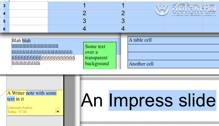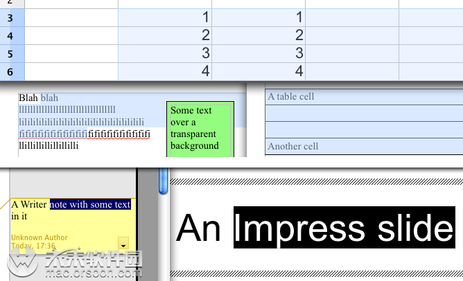 | 本机的Mac文本突出显示 NeoOffice中绘制的突出显示文本与苹果Safari浏览器的文本编辑和应用程序相同。OpenOffice的LibreOffice中和的最新版本试图通过在突出显示的文本顶部绘制系统突出显示颜色的浅色阴影来模拟Mac的本地文本突出显示。但是,许多用户要求我们在NeoOffice中中支持完整的本机的Mac文本突出显示行为,因此我们已经重写了NeoOffice中的OpenOffice底层的LibreOffice和代码中的文本突出显示代码,以绘制突出显示的文本,与苹果公司的各种Mac的应用程序相同。以下屏幕快照显示了NeoOffice中的文本突出显示行为与OpenOffice的的行为相比: |