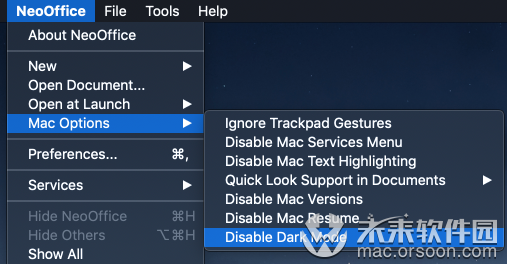 | 本地暗模式 在MacOS上莫哈韦,苹果增加了原始暗模式。在NeoOffice中的工程师已经实施了此Mac功能,当您启用MacOS的暗模式的NeoOffice会自动使用MacOS的暗模式的色彩。 此外,用户还可以在NeoOffice中暂时中断暗模式通过选择NeoOffice中>的Mac选项>关闭黑暗模式菜单项。 | ![]() |