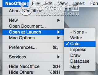 | NeoOffice中>打开在启动菜单打开计算器或印象,而不是作家在发射 在NeoOffice中>打开在启动菜单让您选择当NeoOffice中启动要打开的文档类型。有时情况下,启动时NeoOffice中打开一个Writer文档。然而,我们的许多用户都要求我们提供一种简单的方法,使不同的文档类型,如计算器或加深印象时打开NeoOffice中推出,所以我们添加了NeoOffice中>打开在启动菜单。 当用户选择此菜单中列出的一种文档类型时,NeoOffice中将在您下次启动它时打开所选的文档类型。另外,用户可以选择“ -无- ”菜单项,仅在启动NeoOffice中时显示Mac的菜单栏。右边的屏幕快照显示的NeoOffice>“启动时打开”菜单,其中计算器设置为在启动时打开的文档类型。 | ![]() |