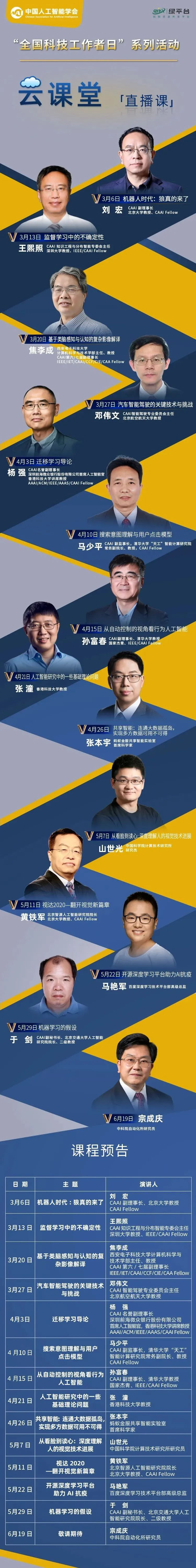 情防控不放松,学习充电不间断。在此特殊时期,中国人工智能学会积极探索学术交流创新模式,围绕AI+学术、AI+技术以屏幕架起连接智能科技知识的桥梁,为学会会员和AI从业者特别开设CAAI云课堂等系列活动。学会集结优质讲师资源依托数字化平台,在中国科协绿平台的支持下,通过前沿优质的课程提供免费高质量的知识服务。让我们开启云端互动,与名师面对面!