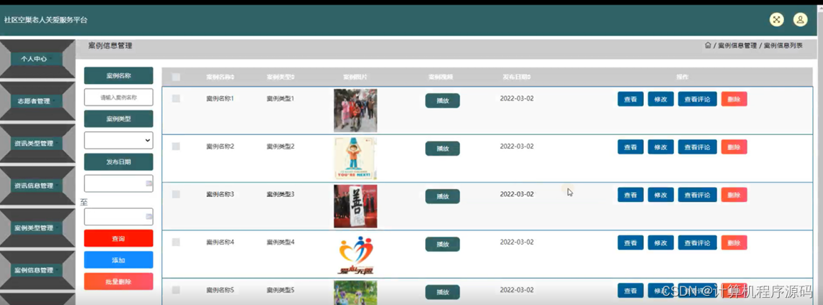 案例信息管理,在案例信息管理页面可以对订案例名称,案例类型,案例图片,案例视频,发布日期等内容进行查看,修改,查看评论和删除操作,如图4-9所示。