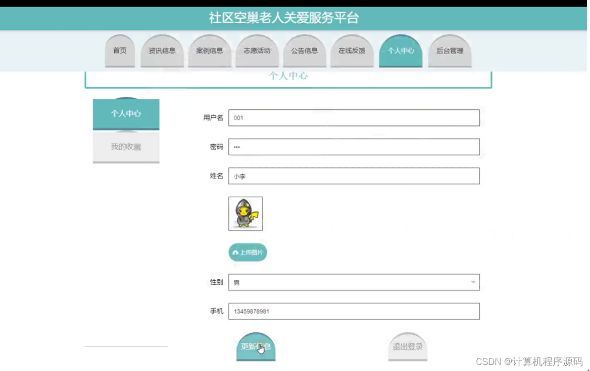 个人中心,在个人中心页面通过填写用户名,密码,姓名,上传图片,性别,手机等内容进行更新信息,还可以根据需要对我的收藏进行详细操作,如图4-3所示。