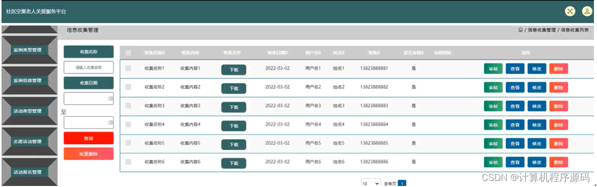 信息收集管理,在信息收集管理页面可以对收集名称,收集内容,收集文件,收集日期,用户名,姓名,收集,是否审核,审核回复等内容进行审核,查看,修改和删除操作,如图4-12所示。