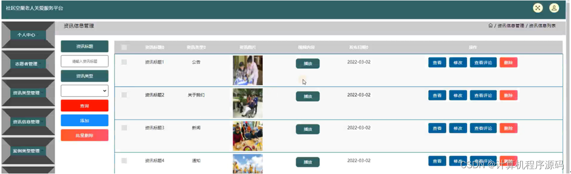 资讯信息管理,在资讯信息管理页面可以对资讯标题,资讯类型,资讯图片,是内容,发布日期等信息进行查看,修改,查看评论和删除操作,如图4-8所示。