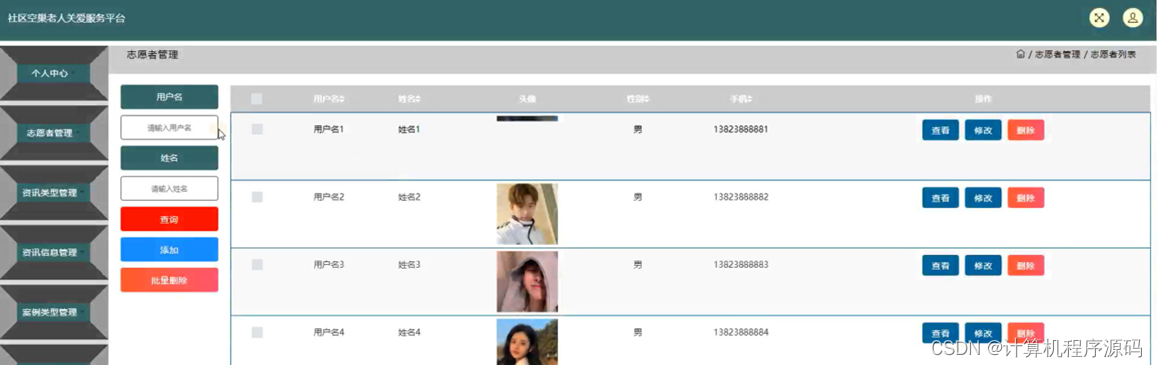 志愿者管理,在志愿者管理页面可以对用户名,姓名,头像,性别,手机等内容进行查看,修改和删除等操作,如图4-6所示。