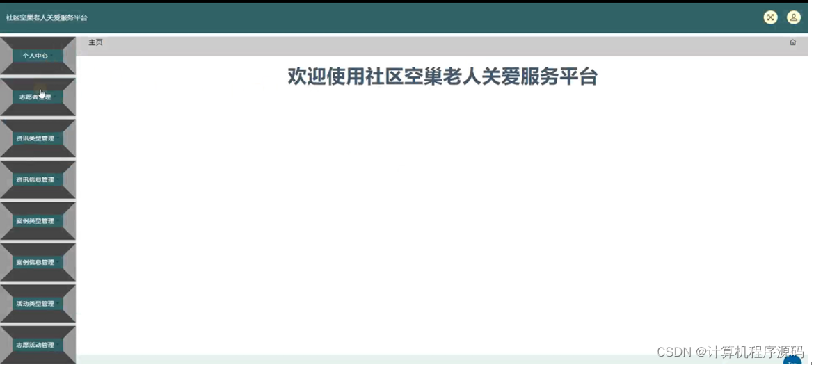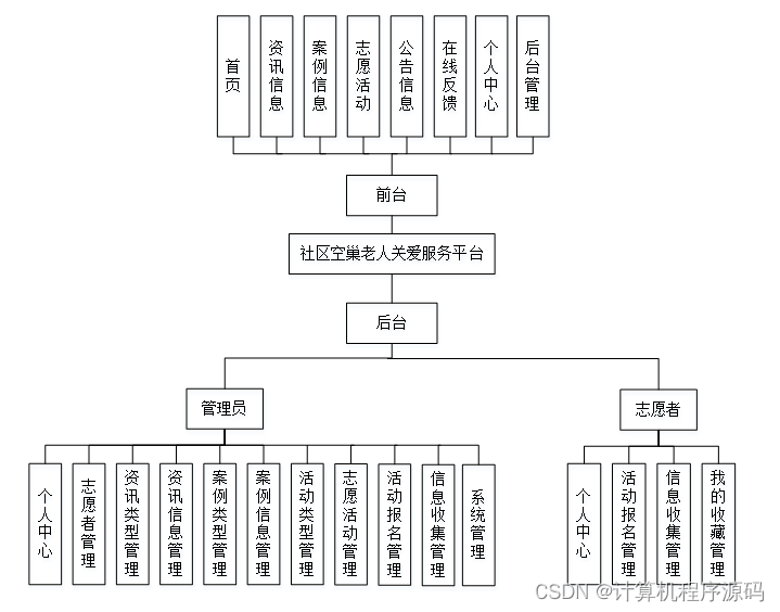 后台主要是管理员,主要包括个人中心,志愿者管理,资讯类型管理,资讯信息管理,案例类型管理,案例信息管理,活动类型管理,志愿活动管理,活动报名管理,信息收集管理,系统管理等等;