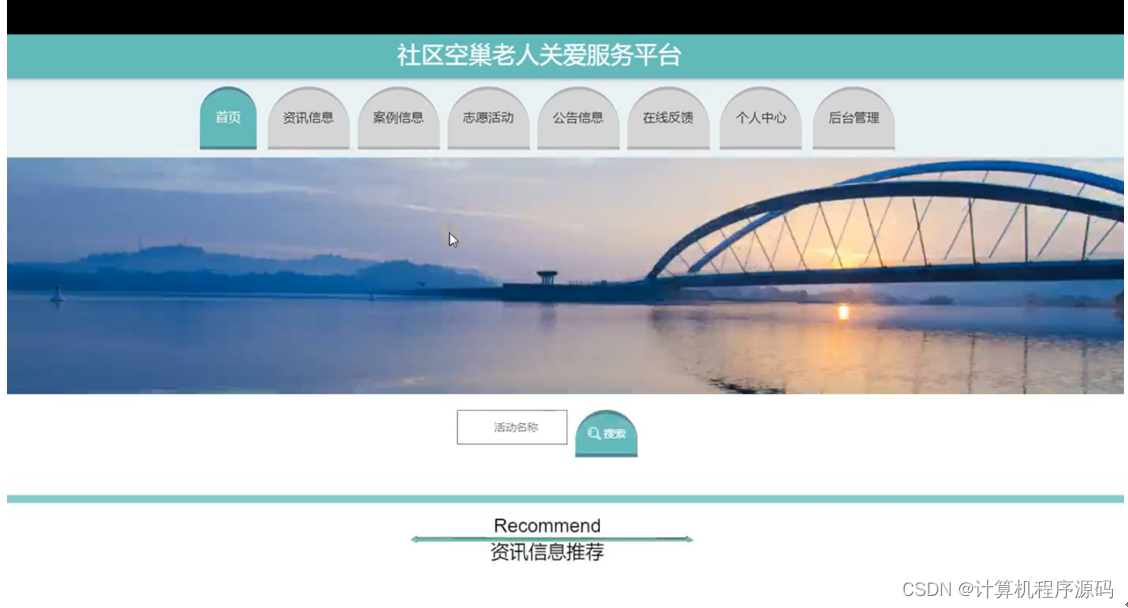 社区空巢老人关爱服务平台,在系统首页可以查看首页,资讯信息,案例信息,志愿活动,公告信息,在线反馈,个人中心,后台管理等内容,并进行详细操作;如图4-1所示。