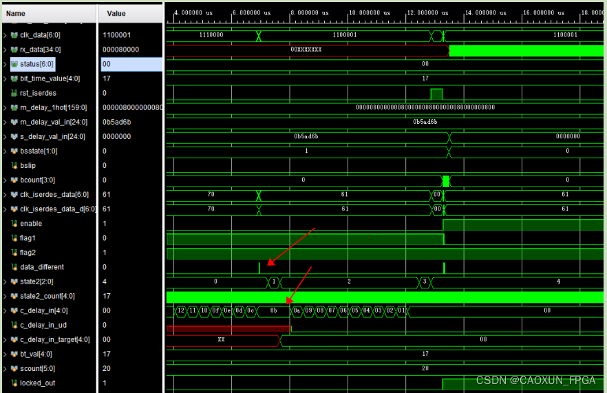 仿真结果如上图的箭头所示,接收的 clk_data 是 7bit 时钟数据,通过调整 c_delay_in 值调整 idelay每次减 1 个 tap,直到 clk_data 发生改变,可以看到这个值是 0b 整好是和中间值相等。这个时候状态机 state2 也会进入状态 1,这个时候计算出 c_delay_in_target=0,这个就是我们需要延迟的时间,可以看到需要延迟的时间为 0,这种情况非常理想,如果实际程序跑起来一般不会是 0,之后进入状态 2。在状态 2 中继续调整 c_delay_in 直到和 c_delay_in_target 相等,如下图,可以看到 clk_data=1100001b 是占比3:4 的时钟就恢复出来了。