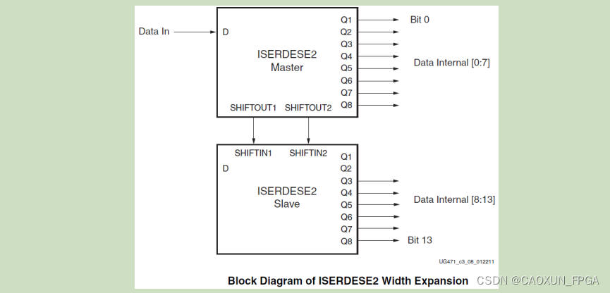 ISERDESE2 在 SDR 模式下数据转换的位宽可以为 2、 3、 4、 5、 6、 7、 8bit,在 DDR 模式时,数据转换位宽为 4、 6、 8bit, 2 个 ISERDESE2 级联使用, DDR 模式可以支持 10、 14bit。 如下图所示通过 2 个 ISERDESE2 级联输出14bit 位宽数据接口。