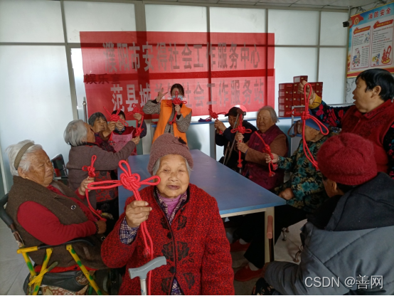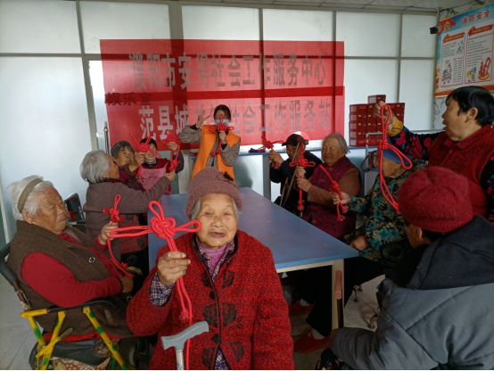 手工兴趣小组的第一节,主题为编织中国结,社工带着活动所需要用到的材料,来到了福寿苑老年公寓。中国结是中国一项独特的传统文化,通过此次活动,社工与老人们迅速拉近了距离。