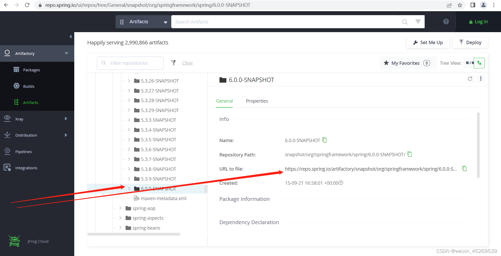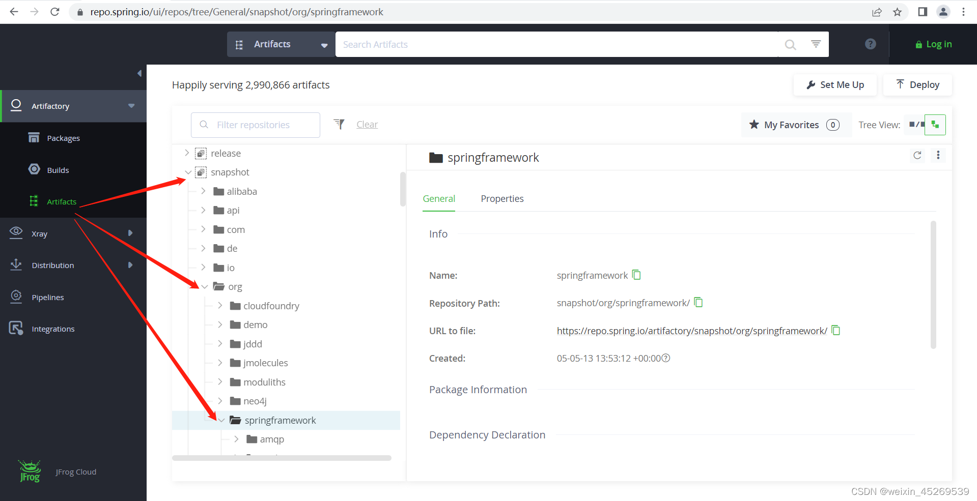 进入后界面往下拉,找到Downloading a Distribution里的https://repo.spring.io. 点击此进入如下界面(或者可以直接在浏览器中访问:JFrog,也可以进入此界面)