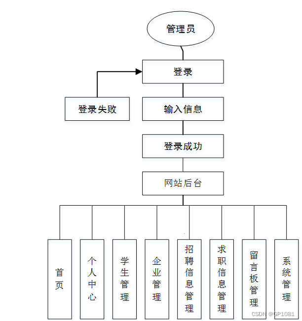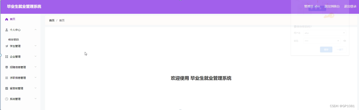 管理员登录进入毕业生就业管理系统后可以查看首页、个人中心、学生管理、企业管理、招聘信息管理、求职信息管理、留言板管理、系统管理等内容进行详细操作,如图5-6所示。