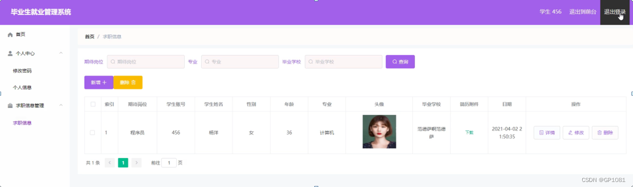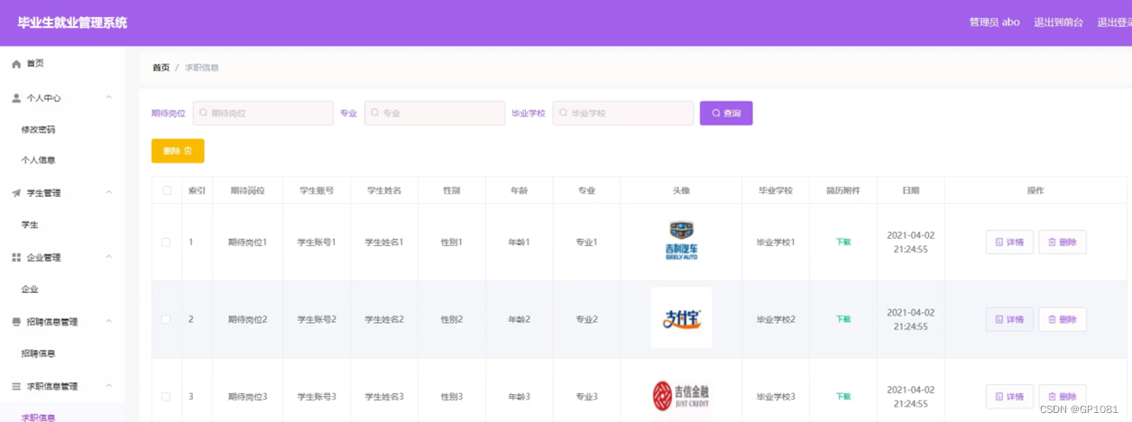 求职信息管理,在求职信息管理页面中可以对索引、期待岗位、学生账号、学生姓名、性别、年龄、专业、头像、毕业学校、简历附件、日期等信息进行详情,修改或删除等操作,如图5-14所示。