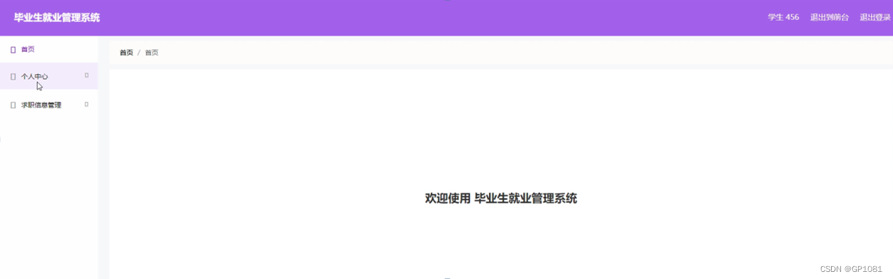 学生登录进入系统可以查看首页、个人中心、求职信息管理等信息进行详细操作,如图5-12所示。