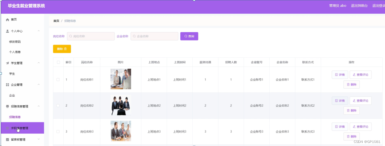 招聘信息管理,在招聘信息管理页面中可以对索引、岗位名称、图片、上班地点、上班时间、薪资待遇、招聘人数、企业账号、企业名称、联系方式等信息进行详情,查看评论或删除等操作,如图5-9所示。